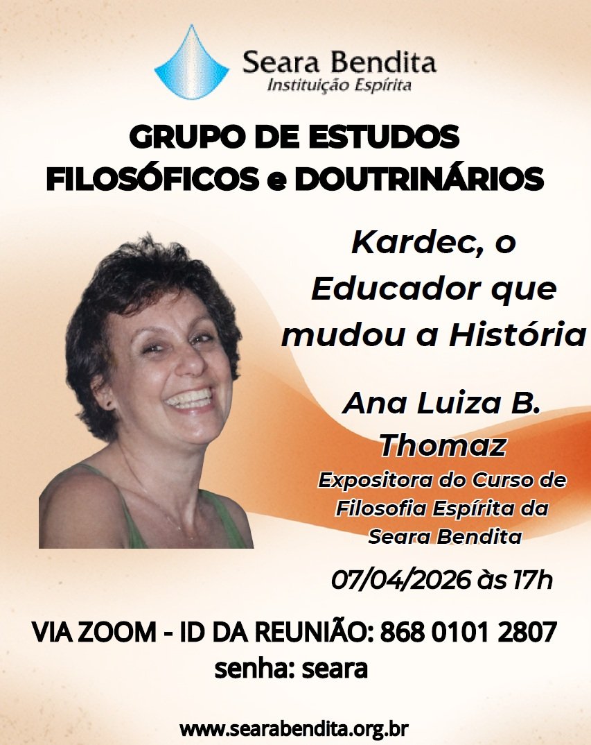 O Grupo de Estudos Filosóficos e Doutrinários da Seara Bendita convida para mais um encontro que terá como tema “Kardec, o Educador que mudou a História”. A exposição será conduzida por Ana Luiza B. Thomaz, expositora do Curso de Filosofia Espírita da Seara Bendita.