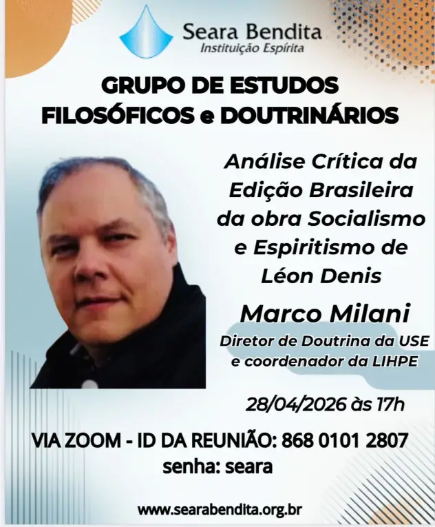 O Grupo de Estudos Filosóficos e Doutrinários da Seara Bendita convida para mais um encontro que abordará o tema “Análise Crítica da Edição Brasileira da obra ‘Socialismo e Espiritismo’, de Léon Denis”. A exposição será conduzida por Marco Milani, Diretor de Doutrina da USE e coordenador da LIHPE.